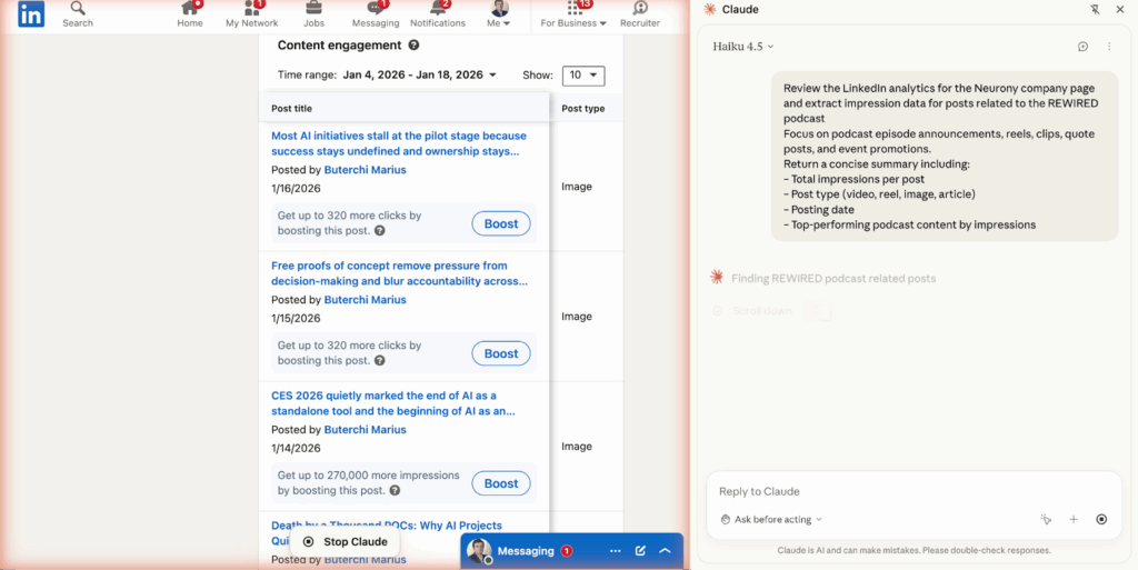 The Claude Chrome extension also allows prompts to be saved as shortcuts, so the same request doesn’t need to be repeated each time. The marketing team set one up to pull LinkedIn analytics from the Neurony company page on a weekly basis. It’s a small automation, but it removes just enough friction to make ongoing monitoring easier and more consistent.